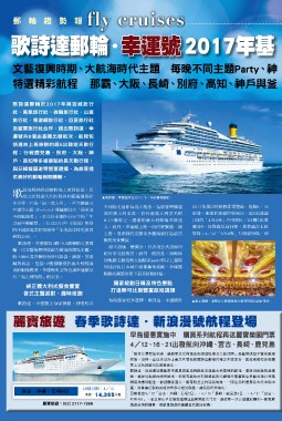 歌詩達郵輪長期推動海上度假旅遊,且 ▲歌詩達.幸運號將在2017╱6╱16於基隆啟航。 2017年推出的航程非常豐富,包括6╱16