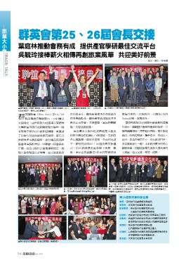 ▲第26屆會長吳毓玲(前排左5)與第26屆幹部合影。 ▲(左2起)群英會第25屆會長葉庭林、創會會長施啟 ▲(左起)經理人協會理事長彭培興、旅行公會總會理事長許禓哲、群英